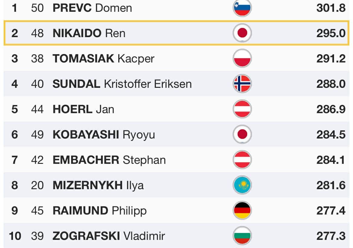 Переможцем впершої спроби став японець Рен Нікайдо – 140 м, 154 очки. Другим став домінатор Кубка світу поточного сезону Домен Превц – 138,5 м, 147 балів.
