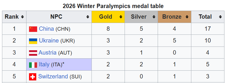 Топ-5 медального заліку Паралімпіади 2026: