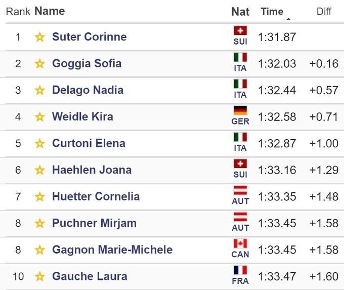 Другою фінішувала італійка Соф'ю Годжа, яка виступала із травмою. А третю сходинку посіла її співвітчизниця Наді Делаго. Вона поступилась золотій призерці на 0,57 секунди. Україна у цьому виді спорту представлена не була.