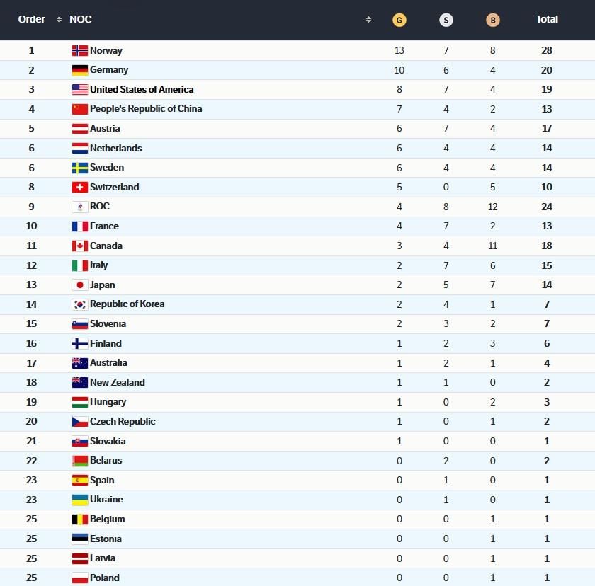 Срібна нагорода Абраменка дозволила "синьо-жовтим" посісти 23-тю сходинку. Усього медалі Олімпіади-2022 поки вигравали 28 команд.