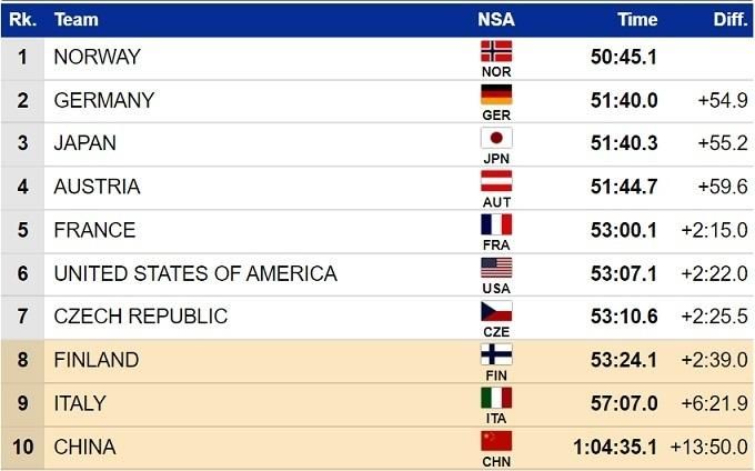 Потужний завершальний етап Йоргена Гробака гарантував золото Норвегії. Срібло здобули німці, а бронзу – японці. Доволі несподівано поза п'єдесталом опинилася Австрія. Додамо, що Україна не приймала участі у командному турнірі.