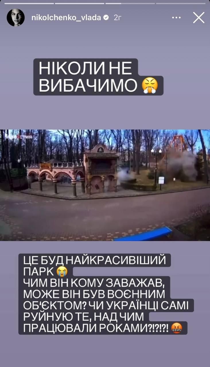 "Ніколи не вибачимо! Це був найкрасивіший парк. Чим він комусь заважав? Може він був воєнним об'єктом? Чи українці самі руйнують те, над чим працювали роками?" – відреагувала Нікольченко на зруйнування одного із парків України.