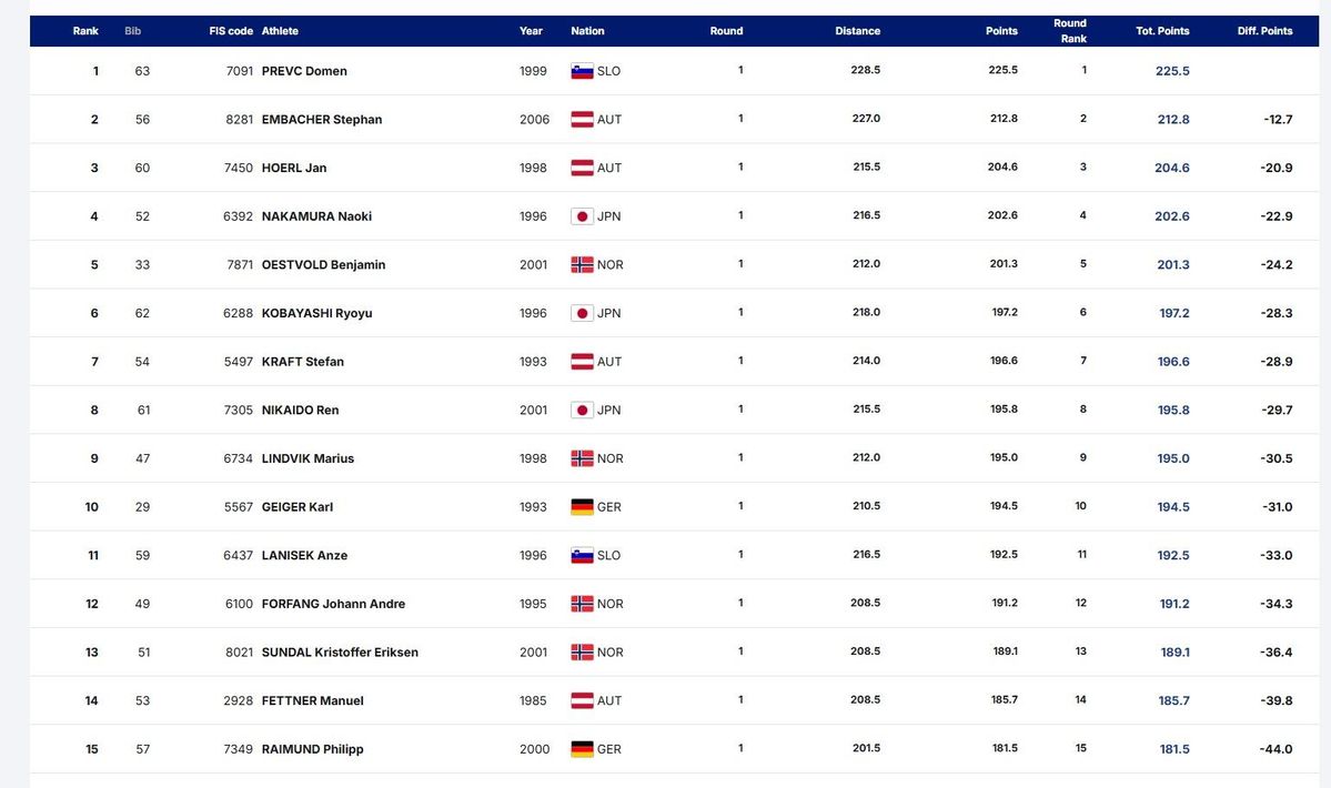 Найкращий результат у кваліфікації продемонстрував словенська суперзірка Домен Превц, який нещодавно виграв Турне чотирьох трамплінів. На світовій першості Превц проелтів 228,5 м, отримав 225,5 бала. Друге місце у відборі посів австрієць Стефан Ембахер, а третє – його земляк Ян Зьорль. Боротьба на польотному трампліні.