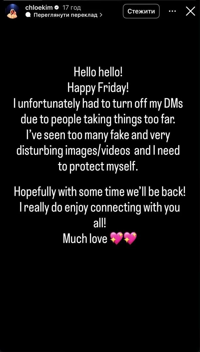 "Мені довелося вимкнути особисті повідомлення, бо люди зайшли надто далеко. Я бачила занадто багато фейкових і дуже тривожних зображень та відео. Я люблю спілкуватися з вами, але деякі речі переходять межу", – пояснила Кім.