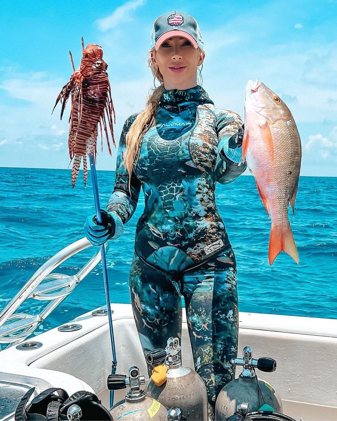 Особливо сколихнула мережу світлина, на якій яскрава білявка позує із рибою, що навіть більша за саму Лорен. Такий улов трапився красуні на Канарських островах. В Instagram Лорен називають "русалонькою".