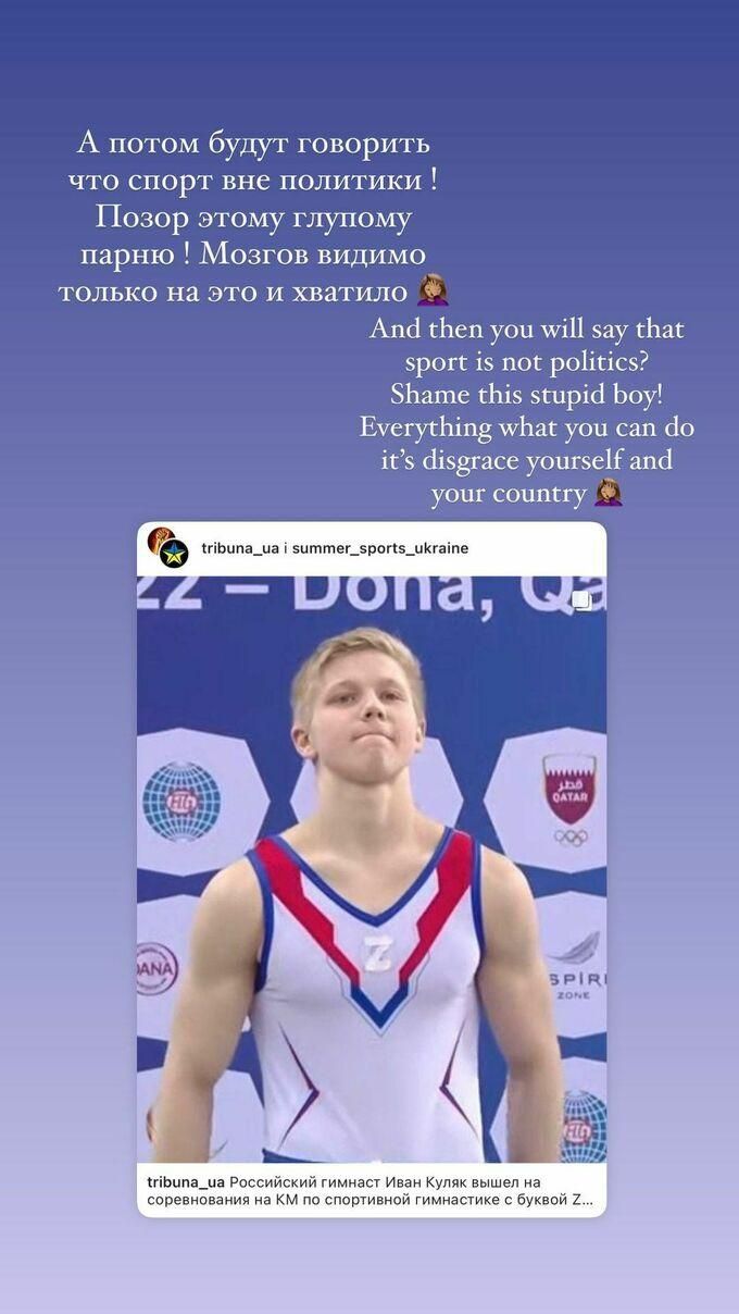 "А потім говоритимуть, що спорт поза політикою. Ганьба цьому дурному хлопцю. Мізків, мабуть, тільки на це й вистачило", – написала Марина Бех-Романчук у своєму Instagram.