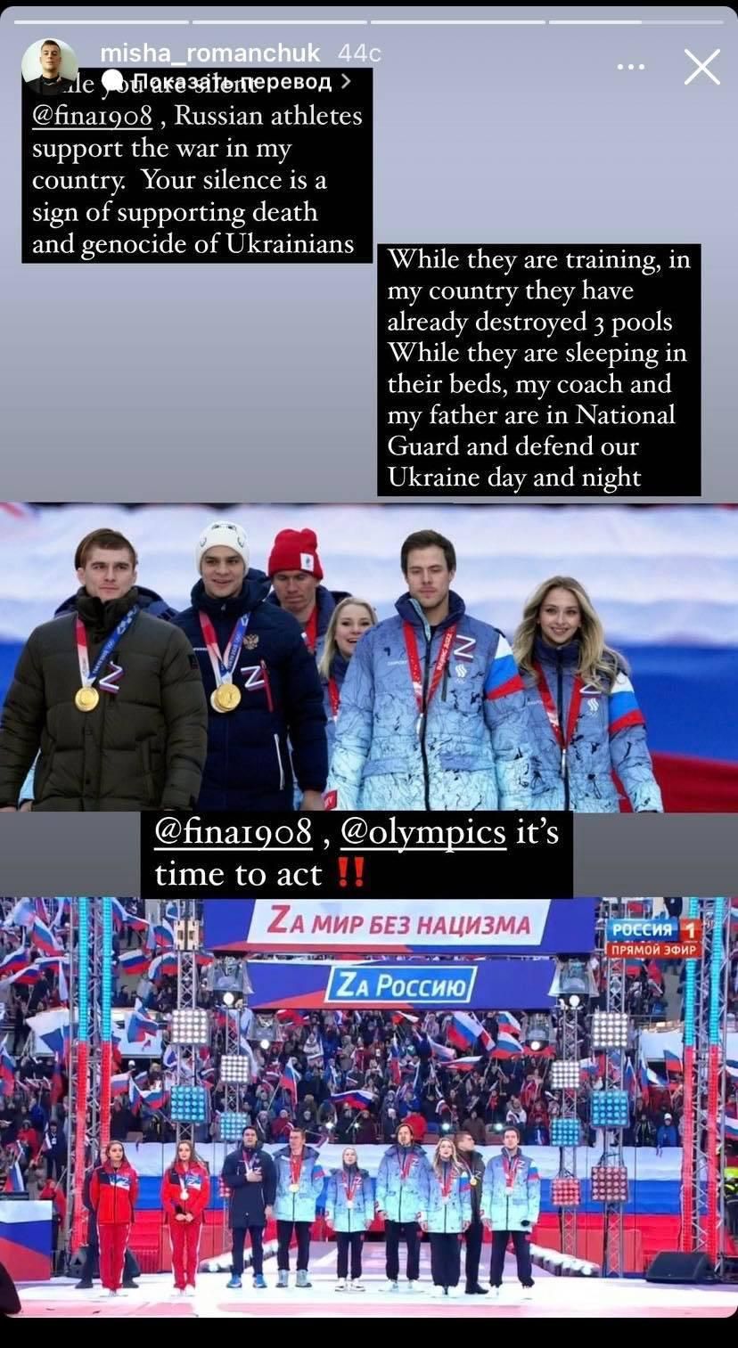 "Поки FINA мовчить російські спортсмени підтримують війну в моїй країні.