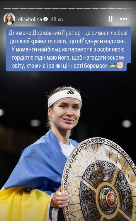 "Для мене Державний прапор – це символ любові до своєї країни та сили, що об’єднує й надихає. У моменти найбільших перемог я з особливою гордістю піднімаю його, щоб нагадати всьому світу, хто ми є і за які цінності боремося", – написала Світоліна в Instagram.