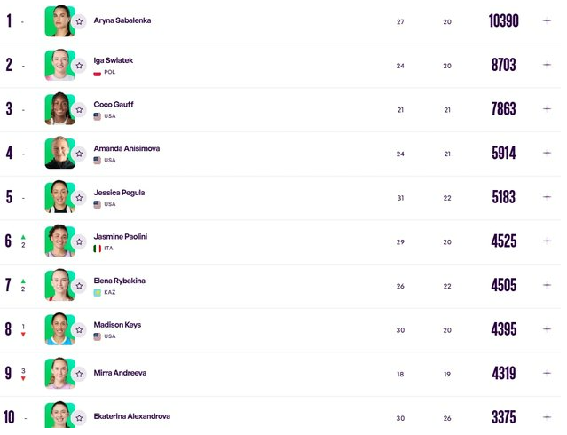 На вершині рейтингу – без змін. Першою залишається білоруска Соболенко, другою йде полька Іга Свьонтек, а на третій сходинці розташовується американка Корі Гофф. Стрімко летить вниз молода та неврівноважена росіянка Мірра Андрєєва, яка втратила одразу три позиції і ризикує вилетіти з топ-10. Відзначимо і +2 позиції в італійської тенісної дюймовочки Жасмін Паоліні, яка піднялася на 6 місце.