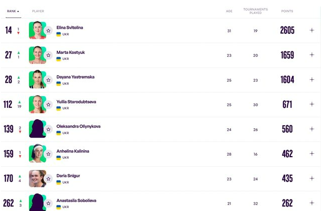 Перша ракетка України Еліна Світоліна втратила одну позицію й наразі займає 14 сходинку. Марта Костюк додала й перемістилася на 27 місце. Впритул до Марти наблизилася Даяна Ястремська, яка нині піднялася на 28 сходинку. Юлія Стародубцева також спрогресувала, піднявшись на 112 рядок. Додають і Дарія Снігур (WTA 170) та Анастасія Соболєва (WTA 262).