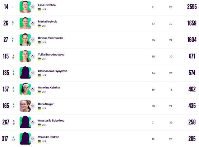 Та найбільший прогрес продемонструвала 18-річна українка Вероніка Подрез, яка перестрибнула аж 110 сходинок – з 427-ї на 317-ї . Це трапилося завдяки її тріумфу на турнірі ITF W75 в Пуатьє.