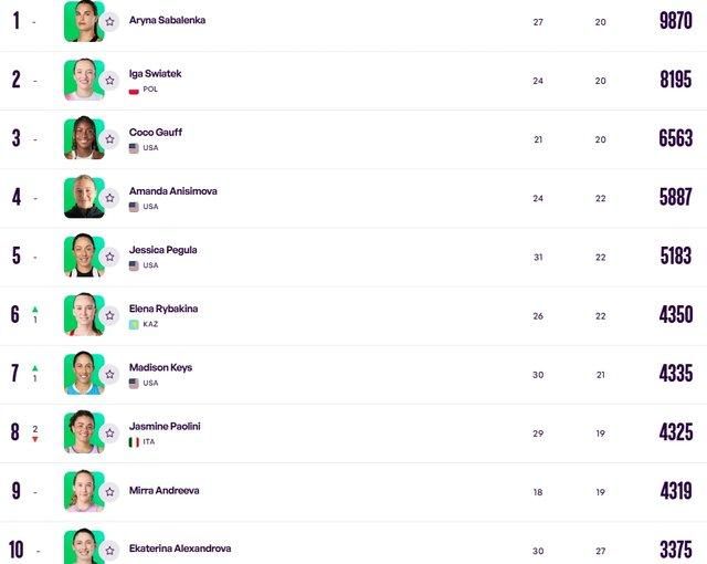 Даяна Ястремська також піднялася на один щабель – зараз вона є 27-ю ракеткою світу. Натомість Юлія Стародубцева опустилася на три пункти і опинилася на 115-й сходинці. Олександра Олійникова піднялася на 4 місця – тепер вона 125-а.