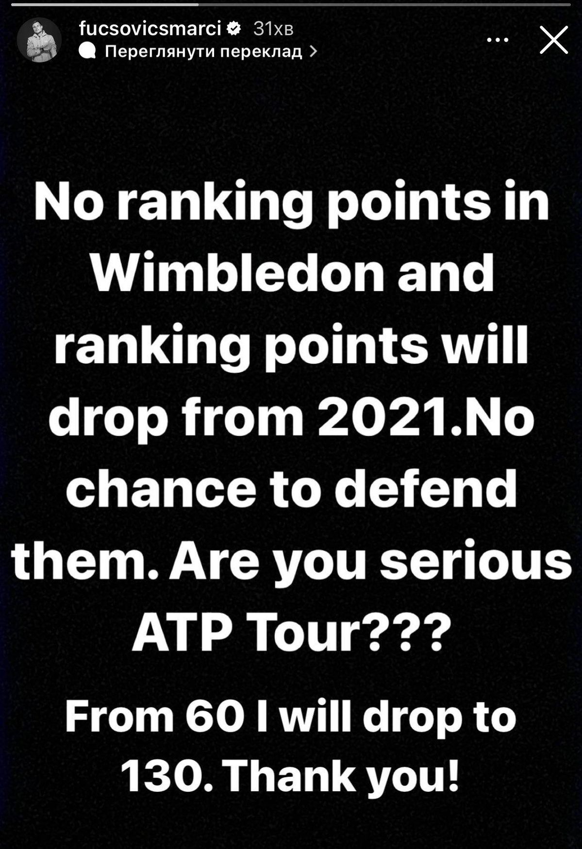 "Без рейтингових очок на Вімблдоні та зняття очок за минулий рік. Жодних шансів їх захистити. ATP, ви серйозно? З 60-го місця я опущуся на 130-те. Дякую!" – написав Мартон у Instagram.