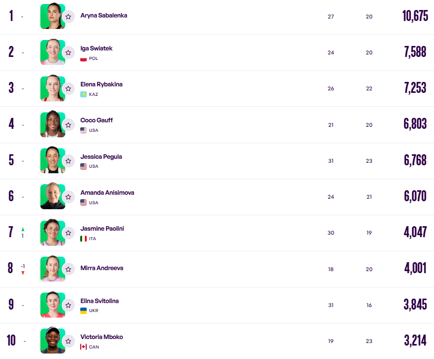 Найкращою серед українок залишається Еліна Світоліна, яка вийшла до фіналу WTA 1000 у Дубаї. Вона залишається на дев'ятій позиції. Загалом у топ-10 мінімальні зміни: очолює список Аріна Соболенко, другою йде Іга Свьонтек. Італійка Паоліні тепер посідає сьому сходинку. Вона випередила "нейтральну" Мірру Андрєєву.