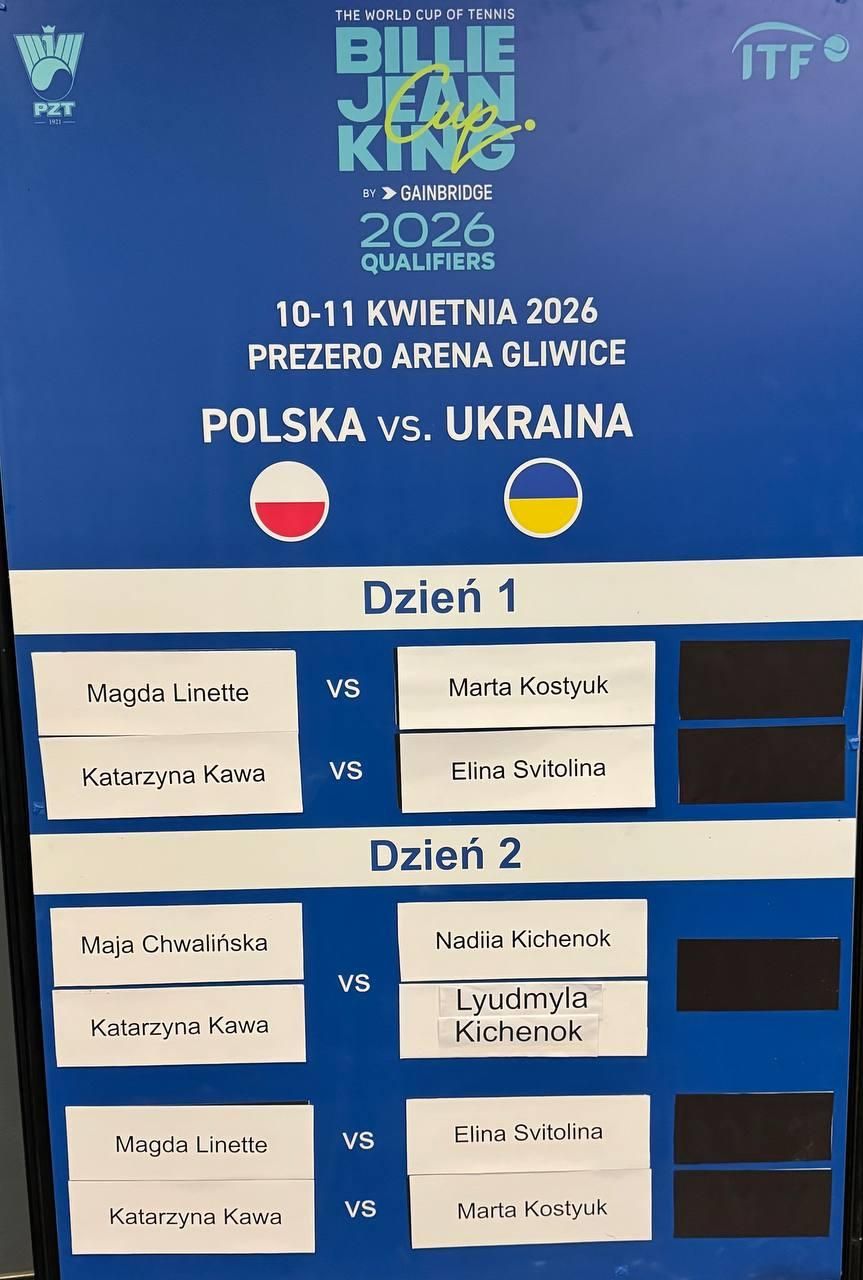 Україна зіграє з Польщею у фінальній частині Кубка Біллі Джин Кінг. Матчі цієї стадії пройдуть 10 і 11 квітня на грунтовому покритті в польському Глівіце. За "синьо-жовтих" виступатимуть Еліна Світоліна, Марта Костюк, Олександра Олійникова, Людмила Кіченок та Надія Кіченок. А от поляки не дорахувалися своєї суперзірки – Іга Свьонтек відмовилася від участі, але замість неї зіграють Магда Лінетт, Мая Хвалінська, Лінда Клімовічова та Катаржина Кава.