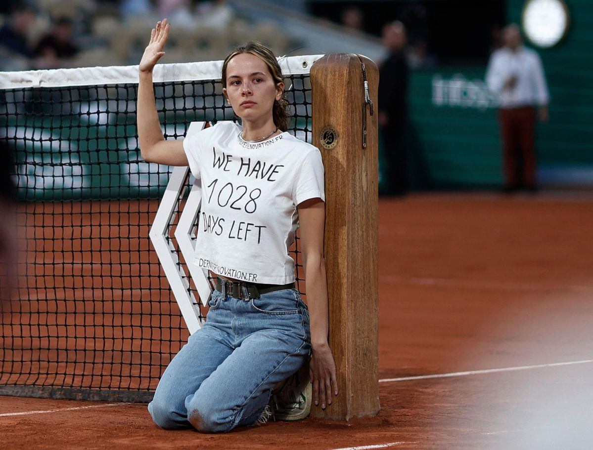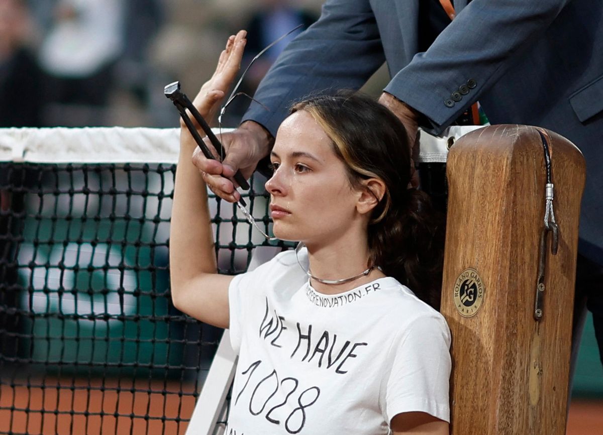Дівчина прикувала себе до тенісної сітки і відмовлялася добровільно покидати корт. Вона є членом міжнародного руху боротьби з глобальним потеплінням. На футболці в активістки був напис "У нас залишилося 1028 днів".