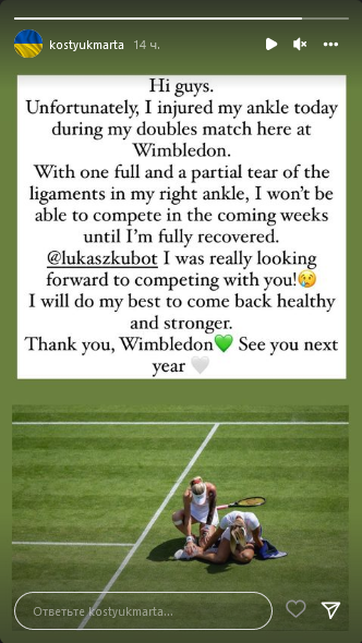 Лукаш Кубот (польський партнер Костюк у міксті, – прим. Спорт 24), я насправді дуже хотіла виступити разом з тобою. Я постараюся докласти всіх зусиль, щоб повернутися здоровою і ще сильнішою. Дякую, Вімблдоне, побачимось наступного року", – написала Костюк на своїй сторінці в Insragram.