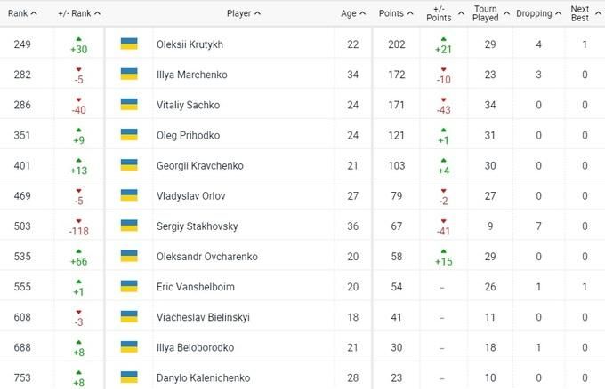 Щодо українців, то Крутих оновив особистий рекорд, піднявшись на 249-ту позицію, та став першою ракеткою України. Ілля Марченко та Віталій Сачко продовжують втрачати позиції.