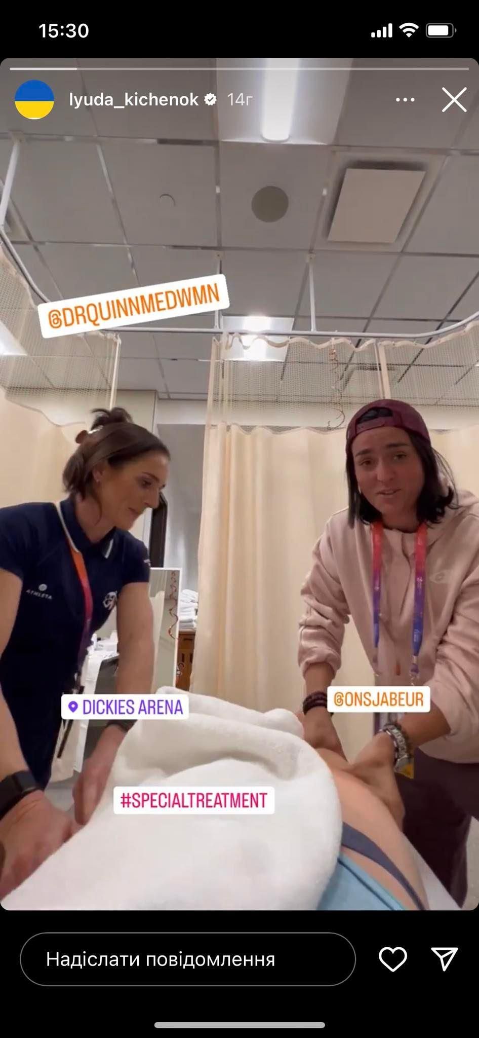 А після завершення півфіналу до масажної кімнати, де перебувала Кіченок, увійшла француженка Онс Жабер. Друга ракетка світу зробила нашій тенісистці масаж та підбадьорила.