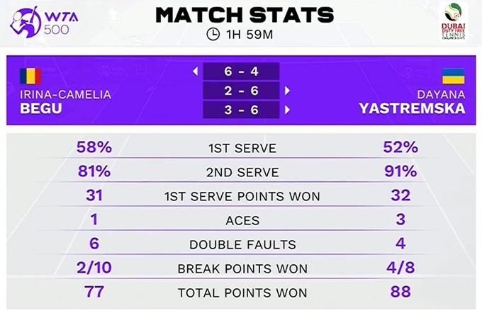 Українка продовжила переможну серію на турнірі WTA 500 у Дубаї. Вона подолала кваліфікацію, а в першому колі здобула перемогу над румункою Іриною Бегу (№54 WTA). Для тенісисток це була перша зустріч.