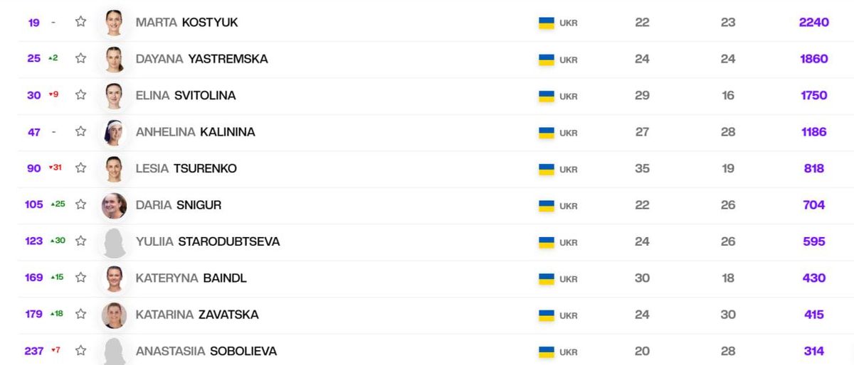 Першою ракеткою України залишилася Марта Костюк. У рейтингу WTA вона знаходиться на 19-й позиції. Це найвищий показник серед інших українок.