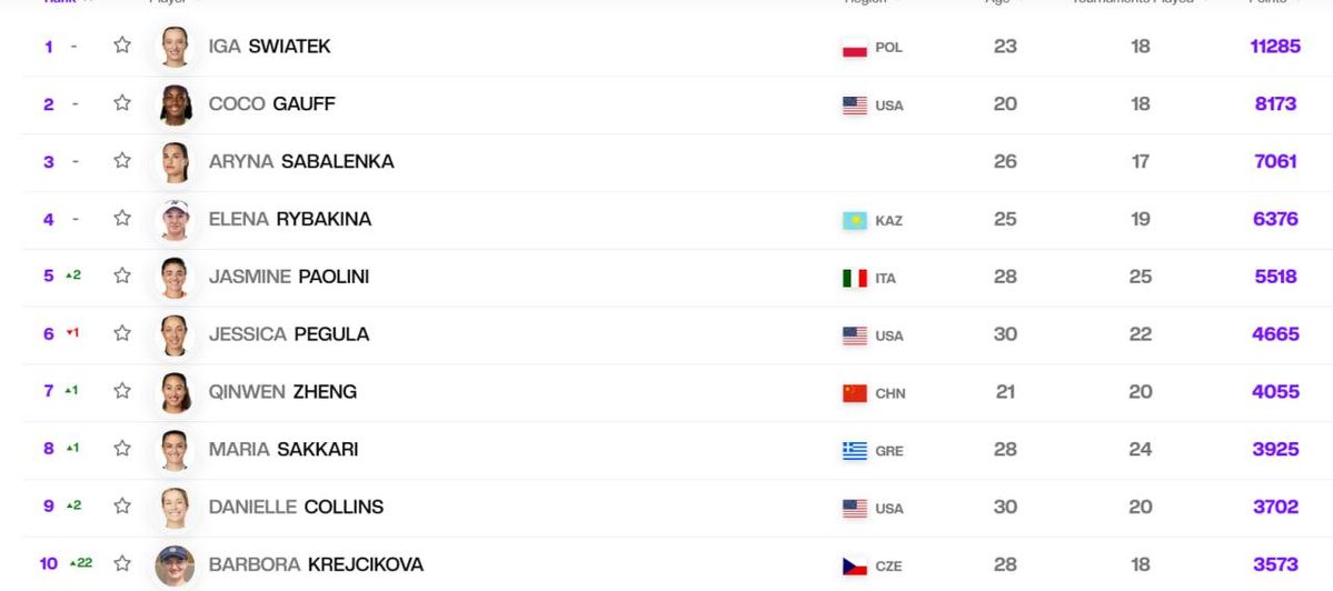 Перша ракетка планети незмінна – це польська суперзірка Іга Свьонтек. Другою йде американка Коко Гофф, третьою – безпрапорна Аріна Соболенко.