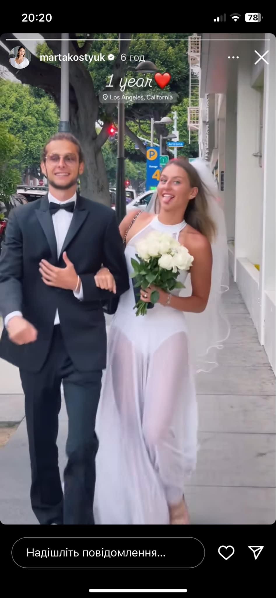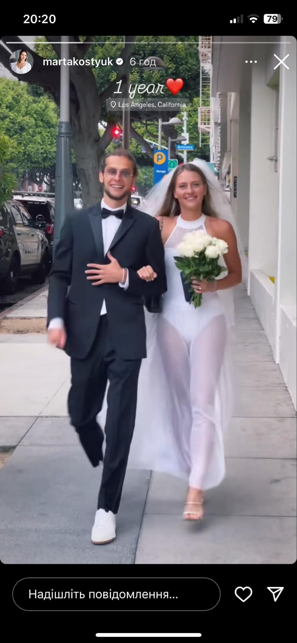 "Один рік", – підписала Костюк і додала емоджі у формі сердечка. Ймовірно, ці кадри були зняті на заручинах. Адже відомо, що офіційна церемонія одраження Марти і Георгія відбулася на Кіпрі. І тоді тенісистка була одягнена в іншу сукню – її спеціально розробив спортивний бренд Wilson.