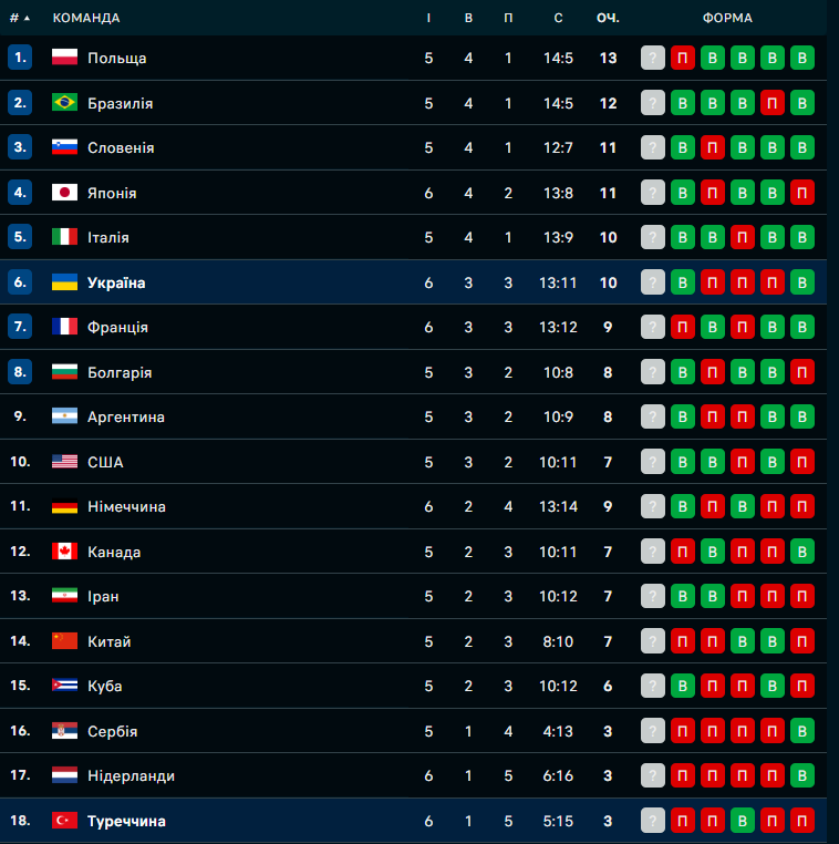Після шести матчів в України 3 перемоги та поразки. Наша команда у турнірній таблиці поки займає шосте місце.