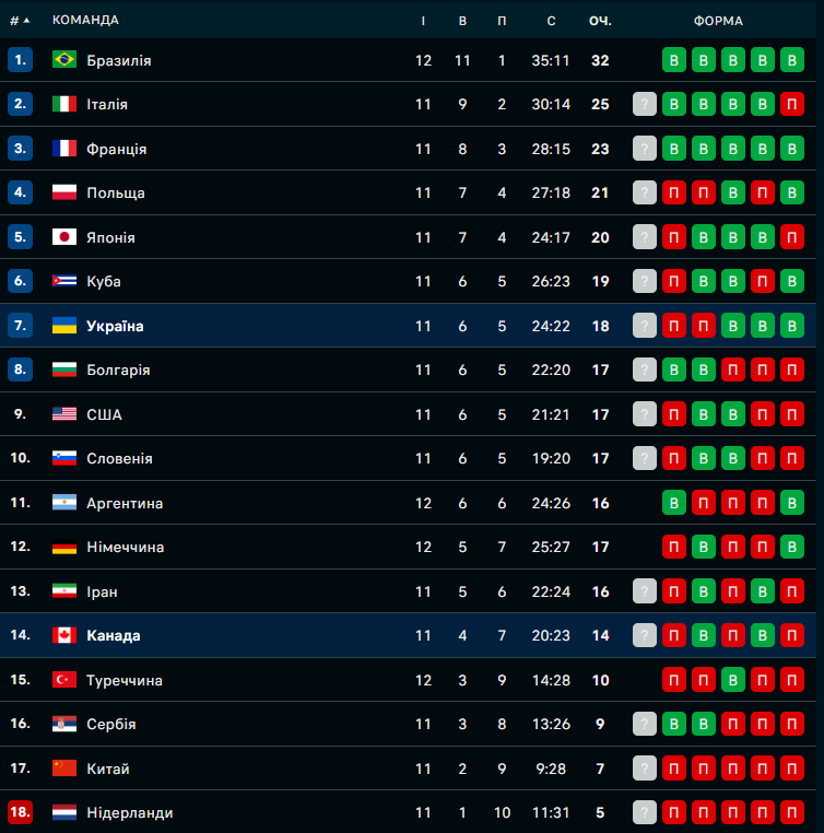 Нагадаємо, що після 11 матчів в активі України 18 очок та сьома сходинка у турнірній таблиці. У плей-офф виходять найкращих 8 команд. Канада на чотирнадцятому місці та втратила шанси на вихід у наступний раунд, тому турнірної мотивації фактично не має.