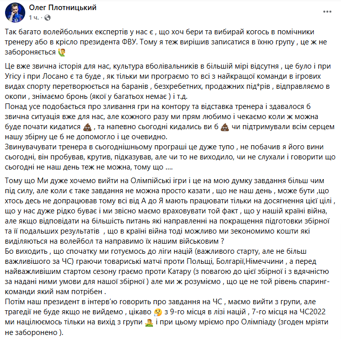 Цей ЧС ще можна виправити й будемо в це вірити. Є день на те, щоб відійти від не найкращого старту, набратися сил і завести нашу машину, ще є два матчі, в яких все вирішиться і, впевнений, більшість вболівальників вірить у це. Вірить, що тренер знайде правильні слова, а гравці знайдуть та віддадуть всі сили на майданчику. Тому давайте будемо ще краще вболівати і менше кидатися гів*ом. Перемоги нашій збірній і віримо, що в плей-офф ми побачимо збірну України", – поділився думками Плотницький на своїй сторінці у Facebook.